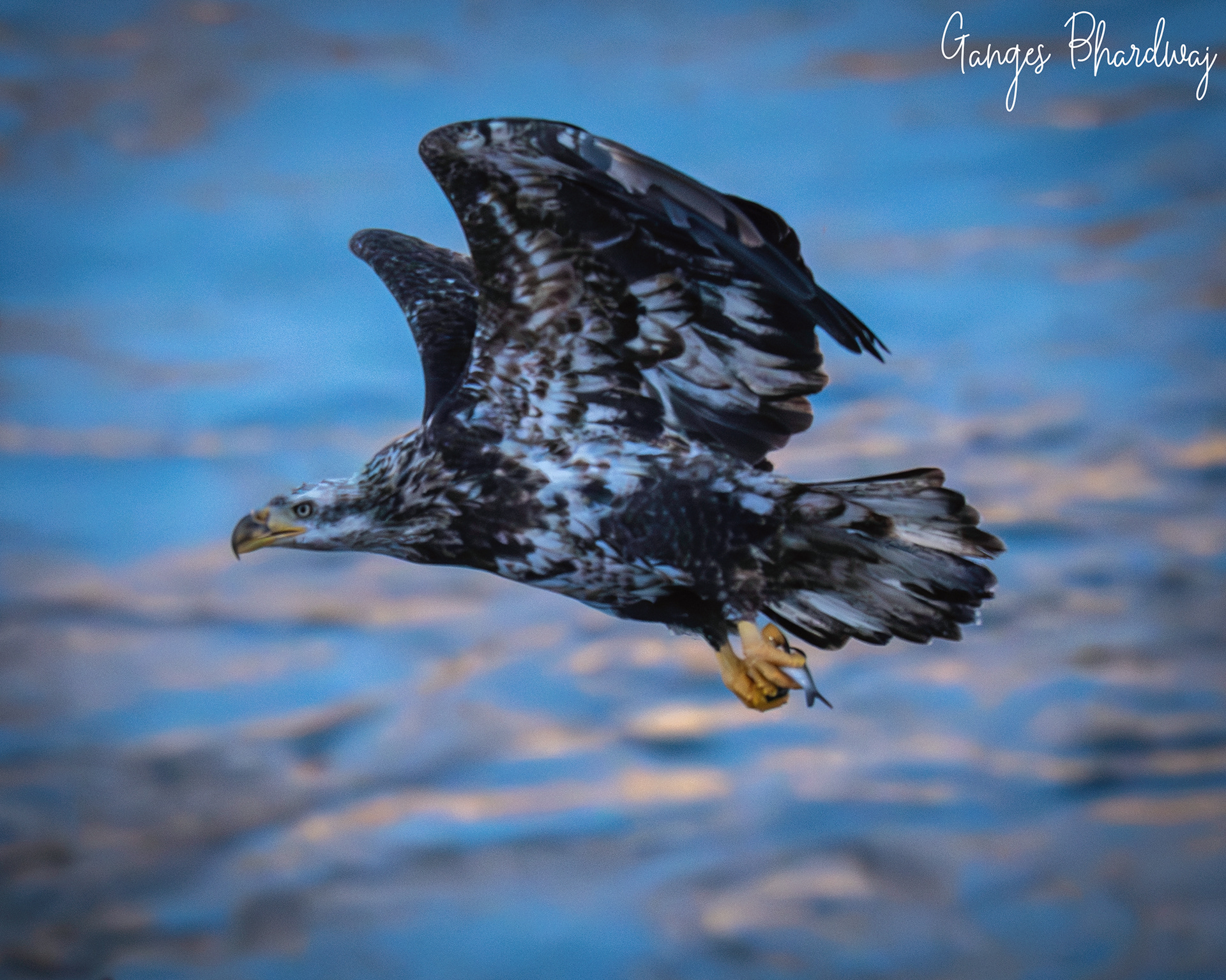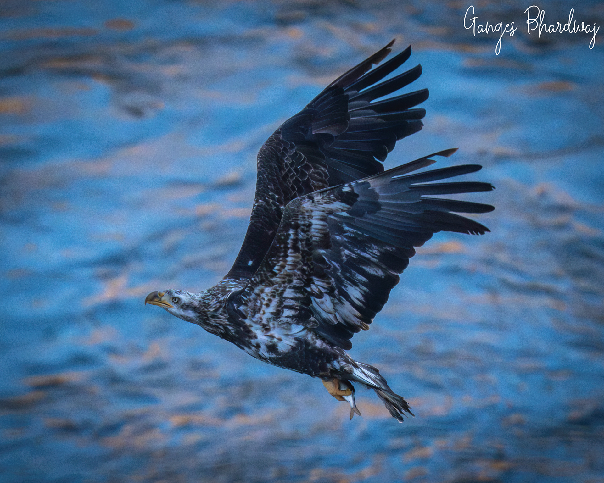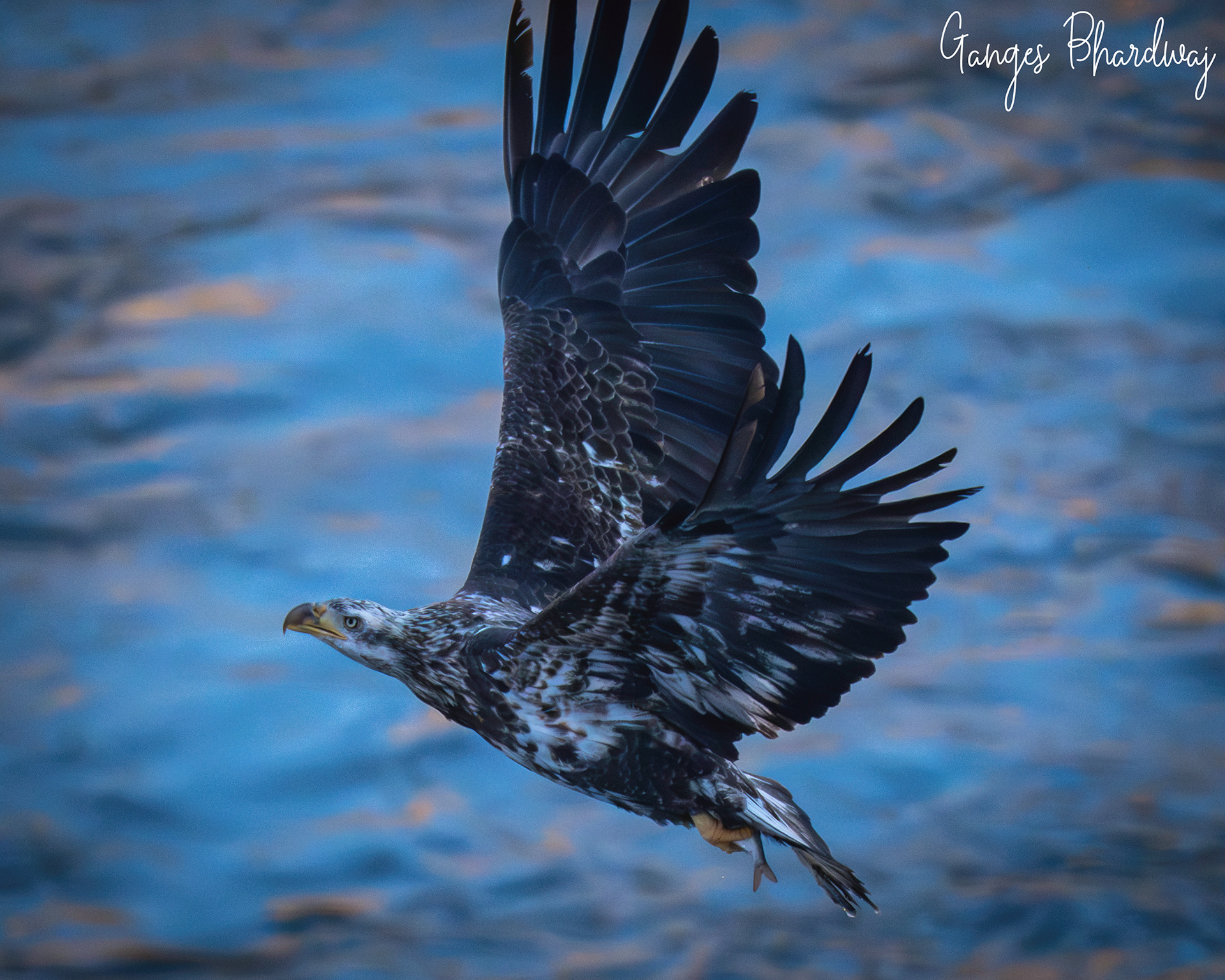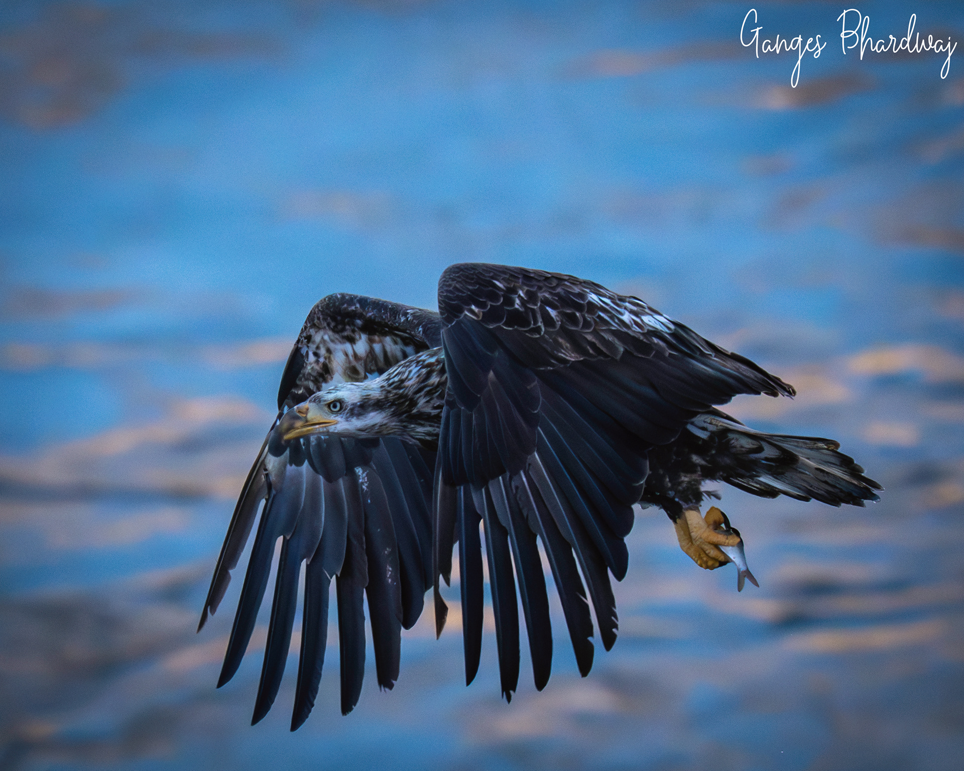 soars into the sky with a freshly caught fish firmly grasped in its powerful talons. The sharp, barbed pads on an eagle's toes and their vise-like grip make holding onto slippery prey mid-flight a natural feat of nature.